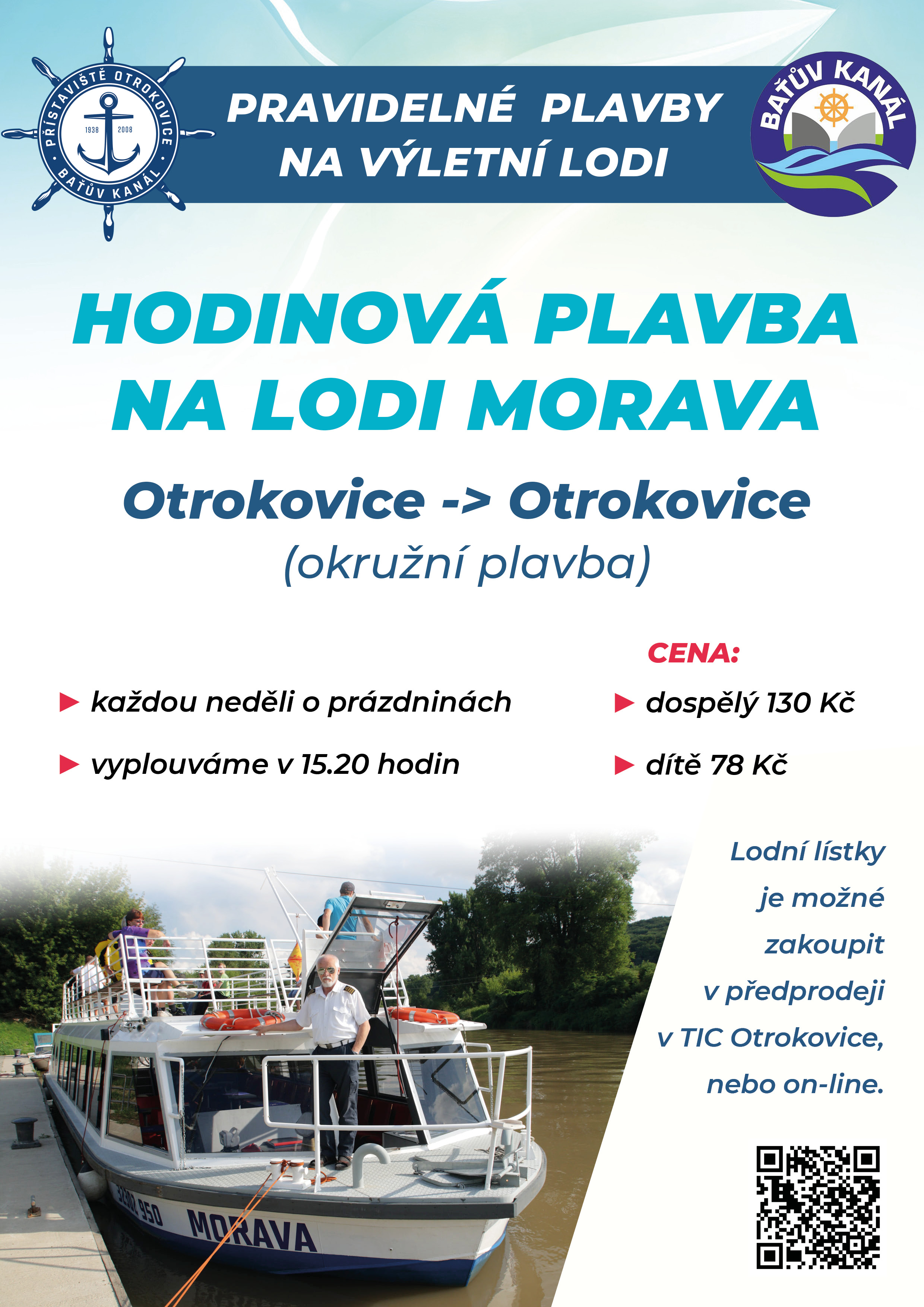 Každou neděli o letních prázdninách se můžete vydat do přístaviště v Otrokovicích a prožít hodinovou okružní plavbu na řece Moravě. Plavba je velmi oblíbená zejména rodinami s dětmi. Pokud máte raději delší plavbu můžete plout např. z přístaviště Spytihněv do Otrokovic. Doporučujeme Vám si včas zakoupit palubní lístky, které jsou v prodeji zde.