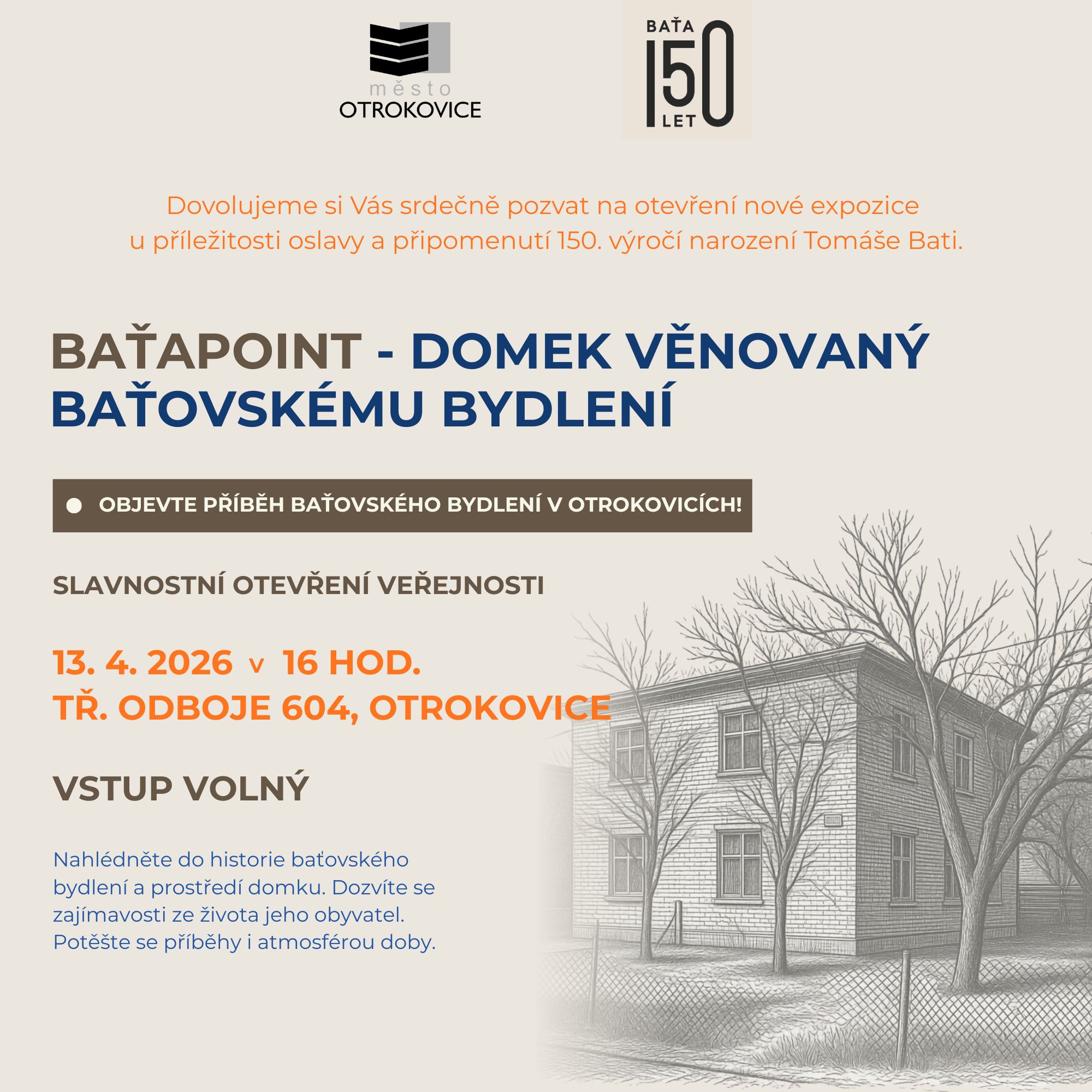 Slavnostní otevření domku s ukázkou Baťovského bydlení bude 13.04. 2026 v 16:00 hodin.